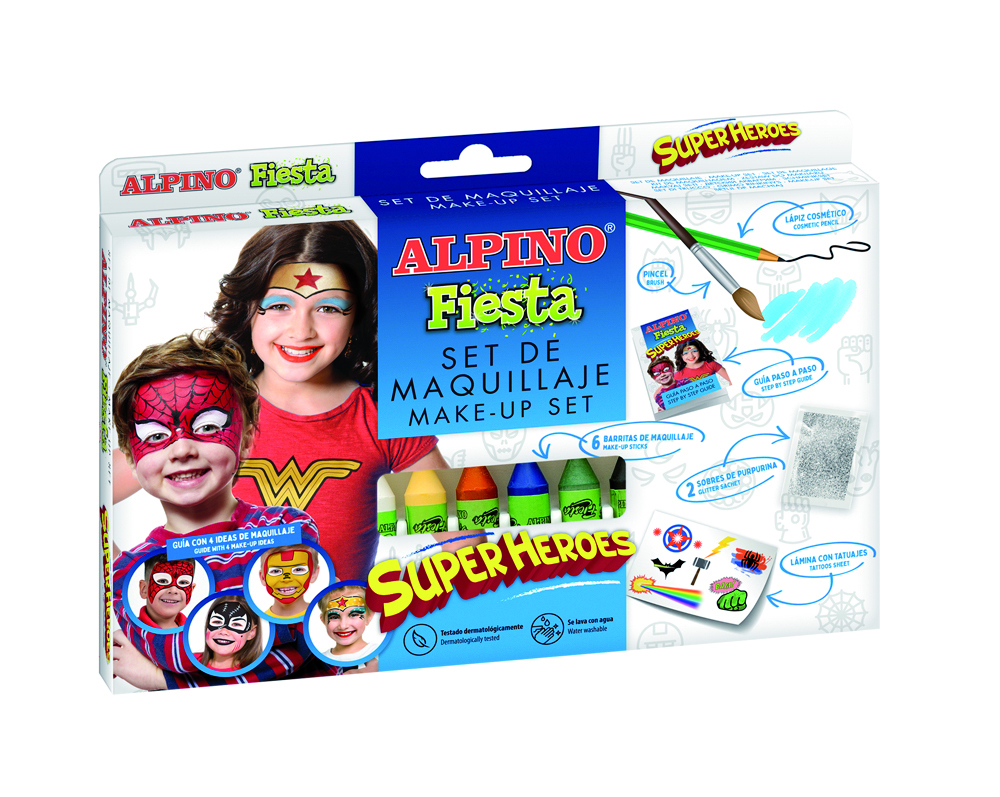 Alpino Sada barev na obličej - SuperhrdinovéObsahuje: 6 ks/5 gr bílé, žluté, červené, modré, zelené a černé barvy, lesklé tetování, kosmetickou tužku, štětec, 2 balení třpytek a brožuru krok za krokem.kosmetický výrobek, dermatologicky testováno, Hotový make-up k okamžitému použití, Použití pro...