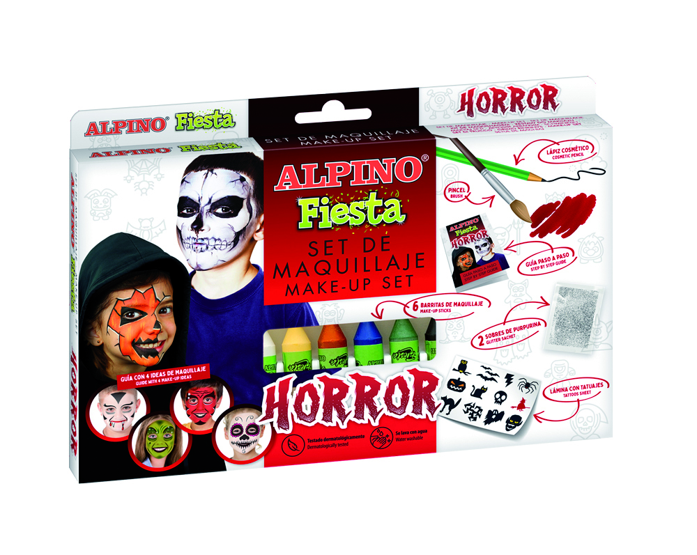 Alpino Sada barev na obličej - HororObsahuje: 6 ks/5 gr v bílé, oranžové, modré, červené, olivově zelené, černé barvě, lesklé tetování, kosmetický tužkový styler, štětec, 2 balení třpytek a brožuru krok za krokem.kosmetický výrobek, dermatologicky testováno, Hotový make-up k okamžitému použití,...