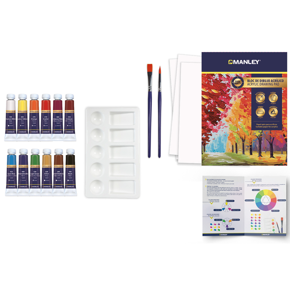 Balení Manley Sada 16ks akrylových barevbalení obsahuje:12 tub akrylových barev (12 ml)1 skicovací blok pro akrylovou barvu (10 listů, 9x12", 9x30,5 cm, 230 g/m^2)2 štětce1 paleta1 příbalový letákUpozornění: Při používání dětmi do 3 let se doporučuje dohled dospělých. przeczytaj całość