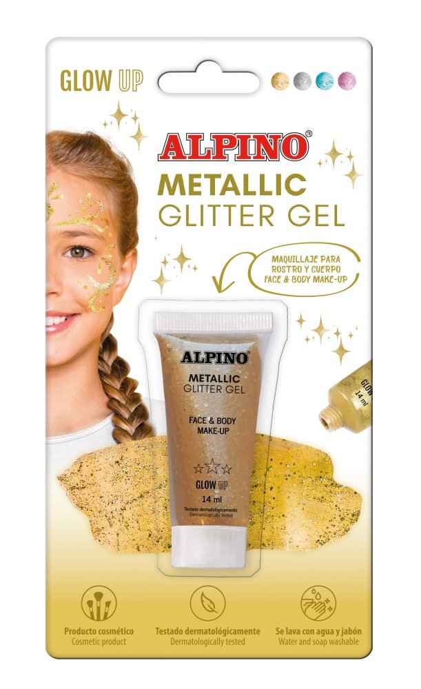 POPIS PRODUKTU:Alpino GLOW UP Metalický třpytivý gel pro make-up obličeje a těla ZlatáMetalická barva na obličej se třpytkami na obličej nebo tělo. Lehká gelová textura pro snadnou aplikaci. Omyvatelný vodou a mýdlem. Dermatologicky testováno. Kosmetický výrobek.Upozornění: Používejte pod přímým...
