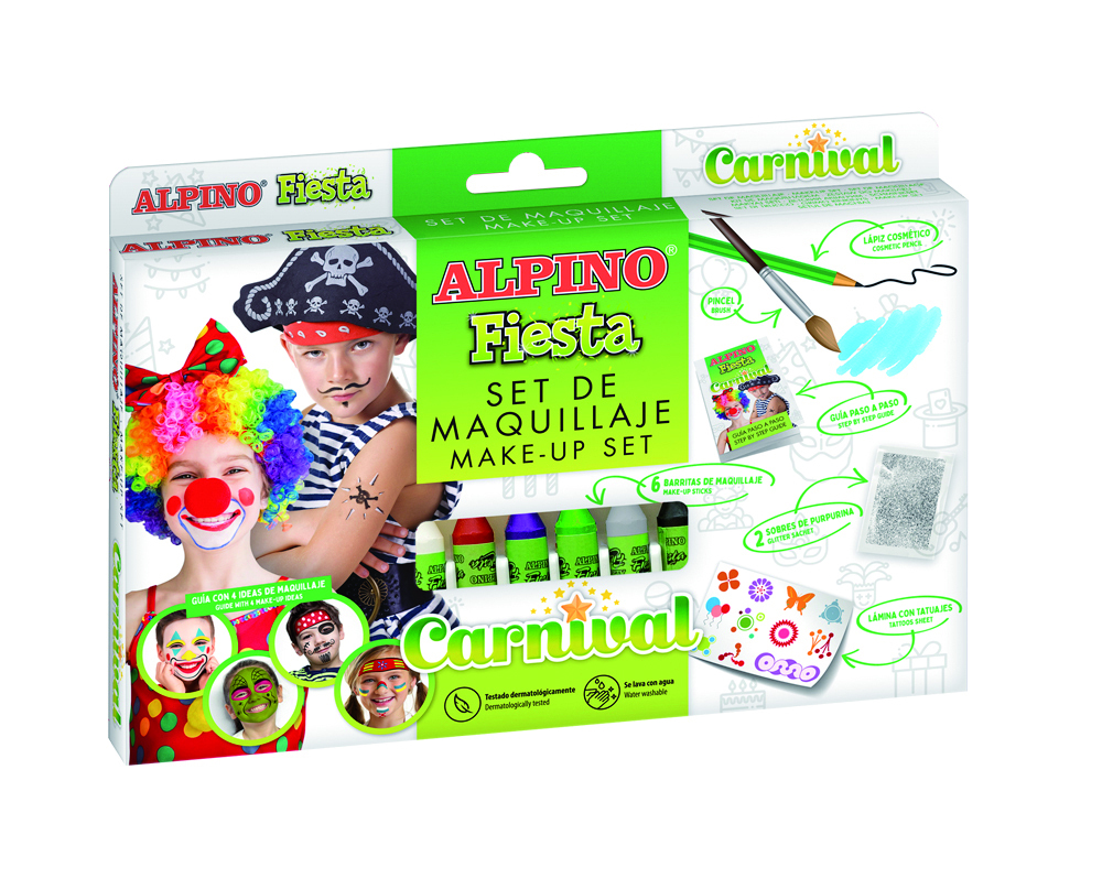 Alpino Sada barev na obličej - KarnevalObsahuje: 6 ks/5 gr v bílé, žluté, růžové, červené, zelené a modré barvy, lesklé tetování, kosmetickou tužku, štětec, 2 balení třpytek a brožuru krok za krokem.kosmetický výrobek, dermatologicky testováno, Hotový make-up k okamžitému použití, Použití pro...