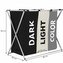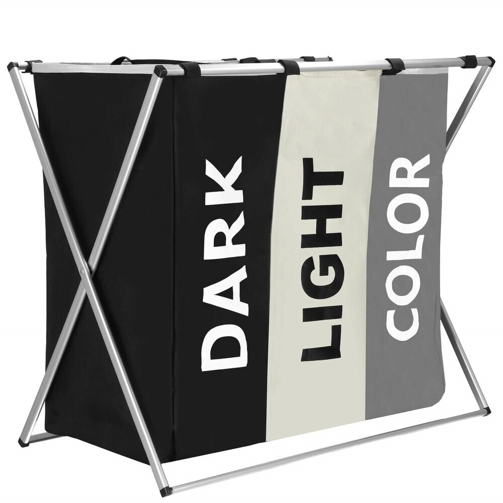 Składany kosz do segregacji brudnej bielizny o pojemności 146 l ma trzy przegrody ułatwiające segregację kolorowej, białej i czarnej bielizny. Lekka aluminiowa rama składa się na płasko, część tekstylna z wytrzymałego poliestru jest wodoodporna i przymocowana na rzepy. Każdą komorę można zamknąć ściągaczem ze siateczką. Praktyczne uchwyty umożliwiają łatwe przenoszenie. Nowoczesny design pasuje do każdej łazienki.