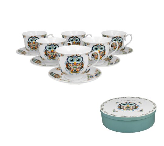 Komplet sześciu filiżanek ze spodkami SOWA ETNO wchodzący w skład serii CROCUS, wykonany z porcelany New Bone China, charakteryzującej się elegancką i naturalną kremowo - białą barwą z delikatnym połyskiem, a także wyjątkową wytrzymałością.Linia zdobiona motywem uroczej sowy wykonanej z...