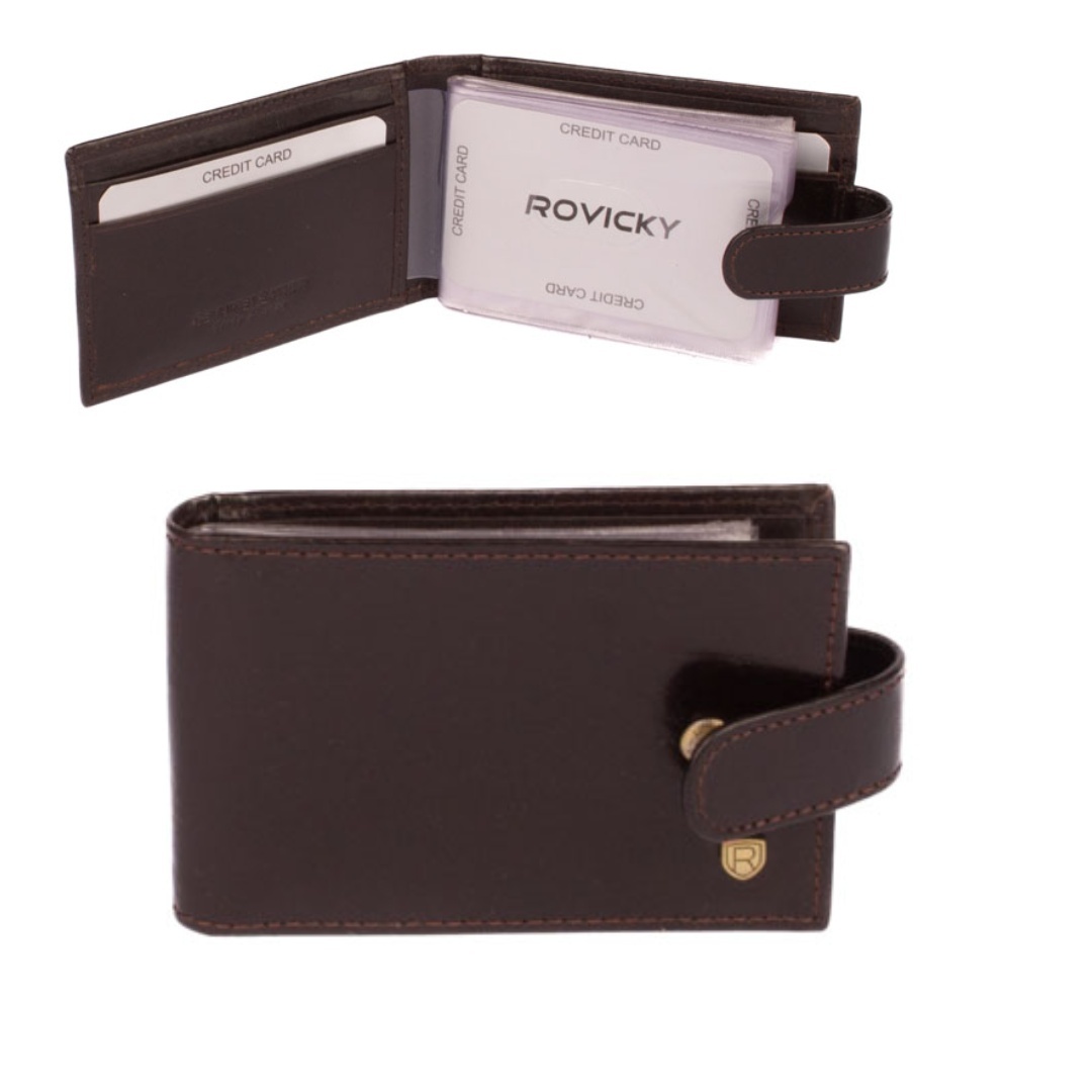Kožené pouzdro na vizitky a karty se uzavírá přezkou s pevným drukem. Uvnitř pouzdra je dostatek kapes na vizitky nebo platební a jiné karty z fólie. Po stranách pouzdra jsou kožené kapsy. Pouzdro je vyrobené z pravé kůže hnědé barvy a je bez loga značky. Do pouzdra je možné uložit 16 karet....