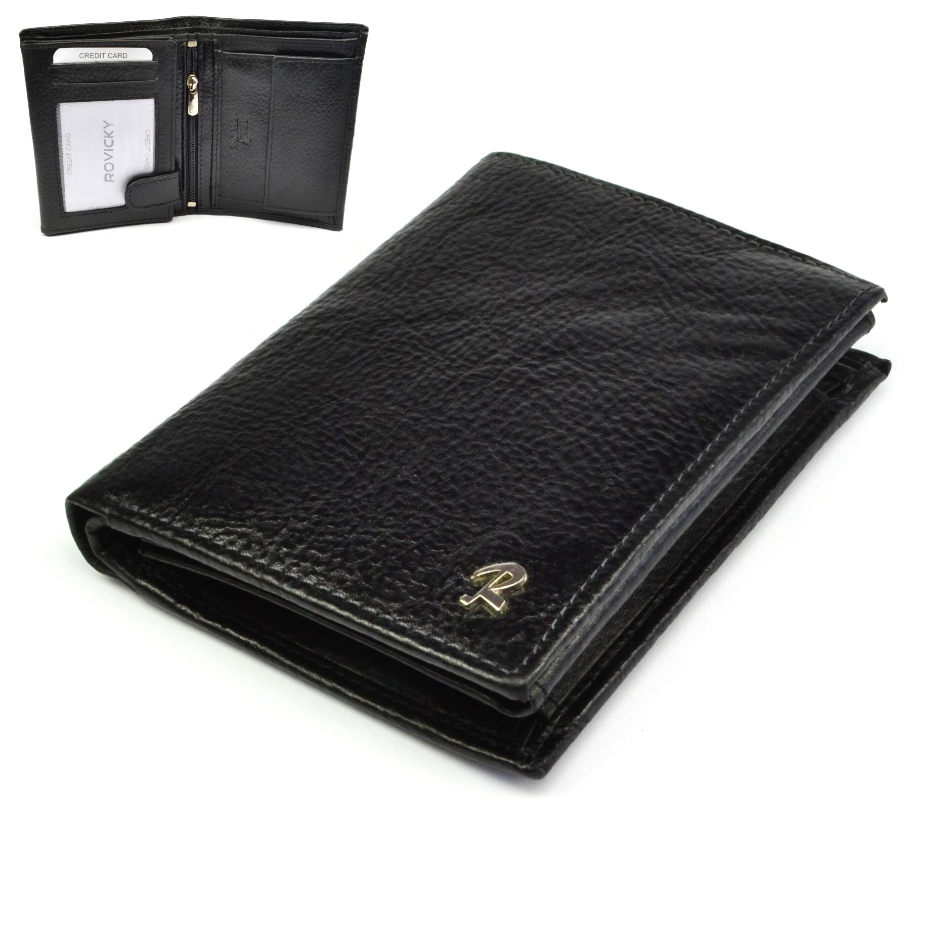 Peněženka pánská kožená černá klasického vzhledu a praktického uspořádání uvnitř. V peněžence pánské najdete vše obvyklé – kapsy na bankovky, karty a doklady, mincovník. Peněženka je vyrobena z pravé kůže černé barvy a je z kolekce oblébené značky Rovicky. Peněženka je dodávána bez krabičky.