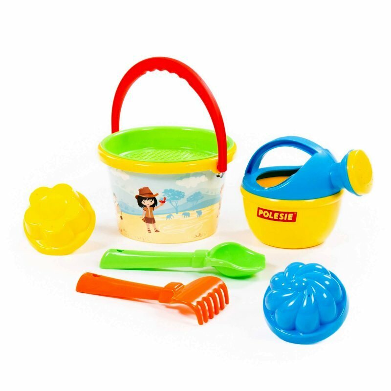 Polesie 4595 Zestaw Nr332: wiaderko średnie z nalepką, sito, szufelka, grabki, 2 foremki, konewka mała