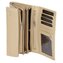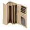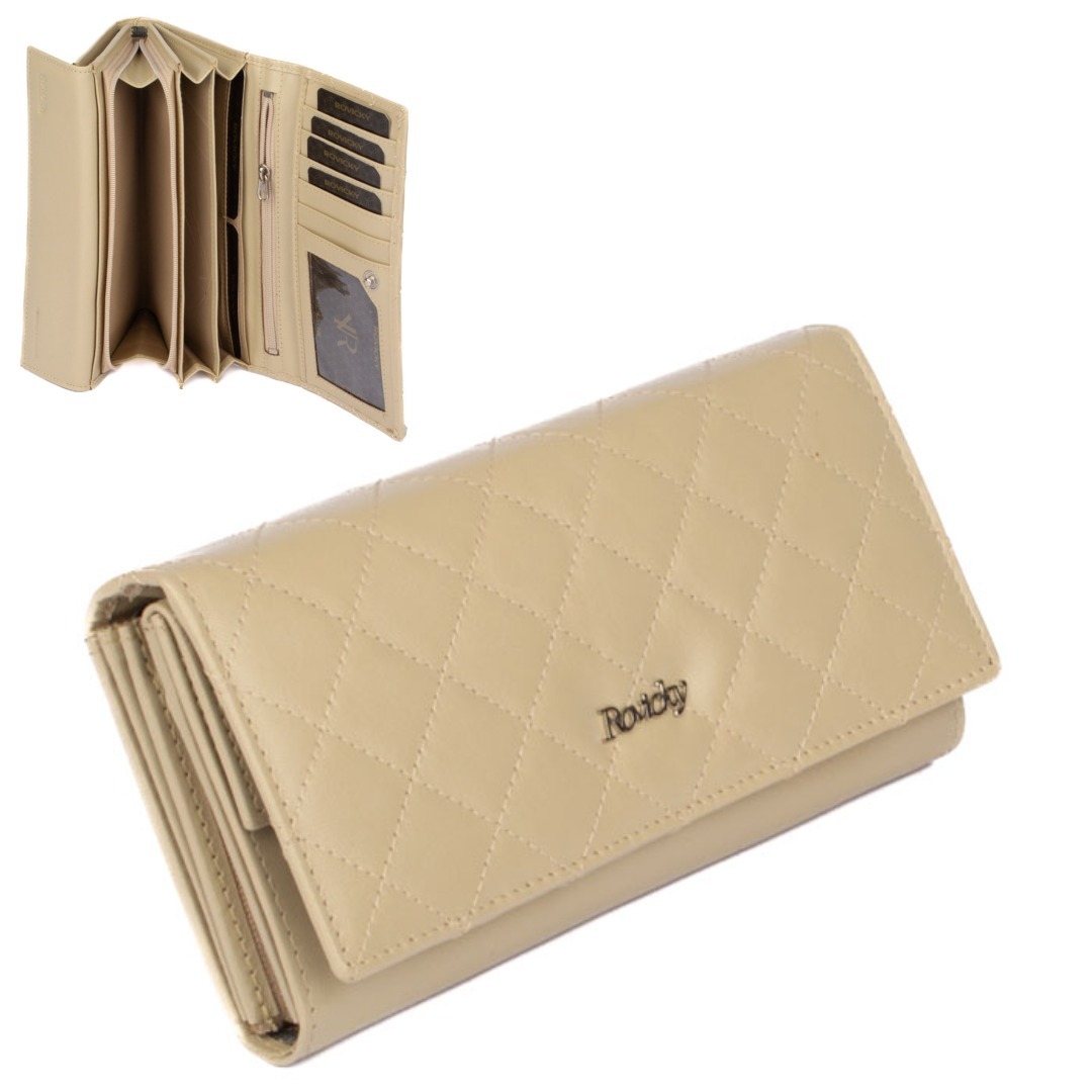Luksusowy damski portfel skórzany jest wykonany z naturalnej skóry w kolorze beżowym. Portfel jest przeszywany cienką nicią z nowoczesnym wzorem rombów. Luksusowy damski portfel skórzany zamyka się klapką na mocny nap. Po otwarciu klapki po prawej stronie portfela znajdują się od razu dostępne kieszenie na karty, jedna z nich jest przezroczysta. W drugiej części portfela znajduje się kolejna klapka z mniejszą kieszenią na całą szerokość portfela. Wewnątrz portfela są duże kieszenie na banknoty na całą szerokość portfela, cienkie kieszonki oraz jedna cienka kieszonka na suwak. Portmonetka zamyka się na zamek i jest przeszyta aż do dna kieszeni, więc żadne drobne nie będą nigdzie rozsypywane. Luksusowy damski portfel skórzany jest wykonany z naturalnej skóry w kolorze beżowym, jest marki Rovicky i jest dostarczany w pudełku upominkowym z logo producenta.