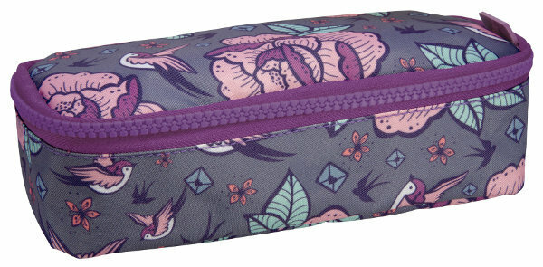 Piórnik owalny z kolekcji FLOWERS w kolorze fioletowo - różowym.W środku dodatkowa kieszonka z siatki.Wymiary: 20,5 x 9 x 5,5 cm.Materiał: 100% poliester. przeczytaj całość