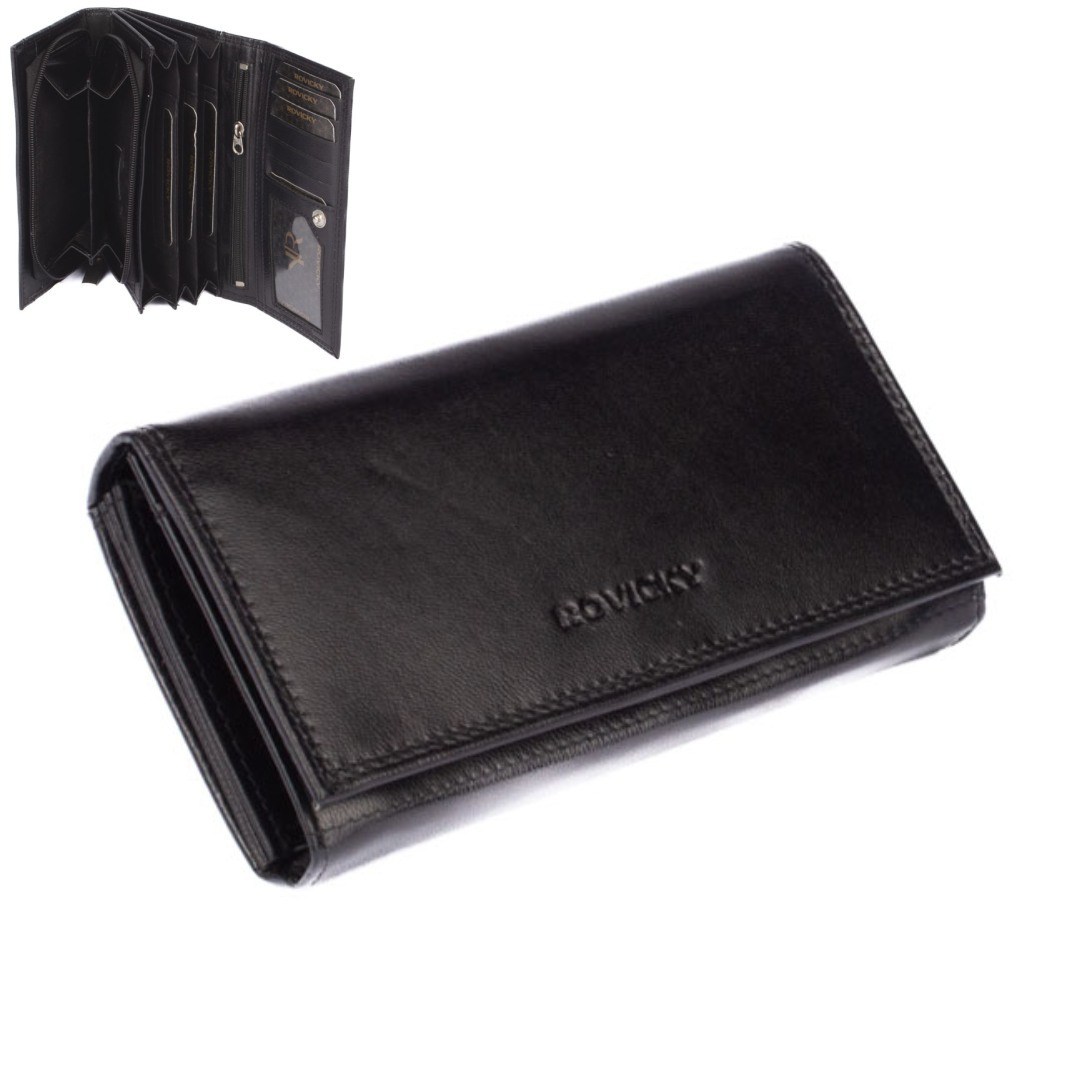 Dámská velká peněženka v klasické černé barvě. Peněženka se uzavírá klopou s pevným drukem. Do vnitřní strany klopy uložíte vaše platební a jiné karty, jedna z kapes je průhledná. V další části peněženky jsou velké kapsy na bankovky a tenké kapsy. Jedna z nich je na zip. Mincovník se uzavírá...