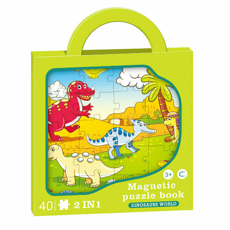Puzzle magnetyczne to zestaw dwóch obrazków po 20 elementów, przedstawiający bawiące się Dinozaury. Kolorowe magnesy układa się na tablicy magnetycznej, dzięki czemu zabawa jest możliwa nawet podczas podróży. Dzieci mogą się wspomagać rysunkami dołączonymi do zestawu. Podczas zabawy dzieci ćwiczą...