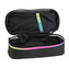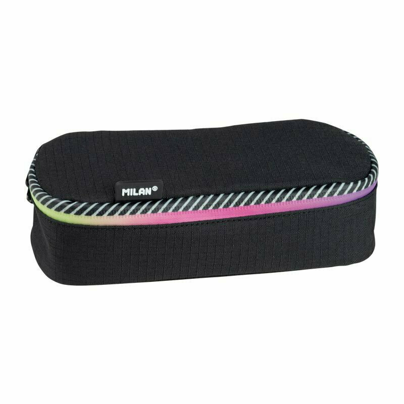 Piórnik owalny MILAN zapinany na suwak z kolekcji SUNET w kolorze czarnym. Wielokolorowa lamówka przy suwaku. W środku dodatkowa kieszonka z siatki. Materiał: Materiał: zewnętrzny i wewnętrzny 100% poliester. Rozmiar: 20,5 x 9 x 5,5 cm. przeczytaj całość
