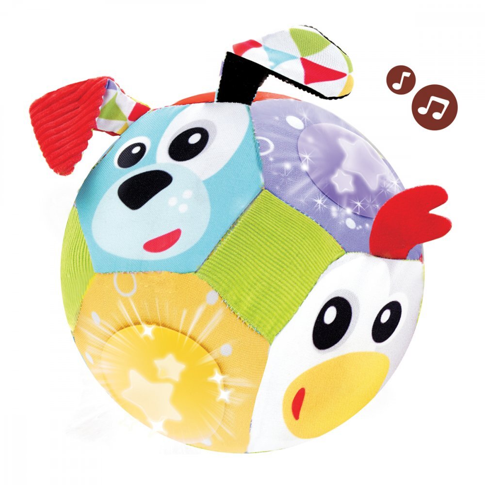 Při jakémkoliv pohybu míče začne hrát veselá melodie a rozsvítí se barevné hvězdičky. Tímto se dítě učí vztahu „příčina-následek“. Pobízí dítě, aby míč stále házelo a lezlo za ním.Míč je velmi lehký, měkký a zvířátka jsou vyrobena z různých druhů textilií. Na míči je praktické poutko pro...