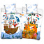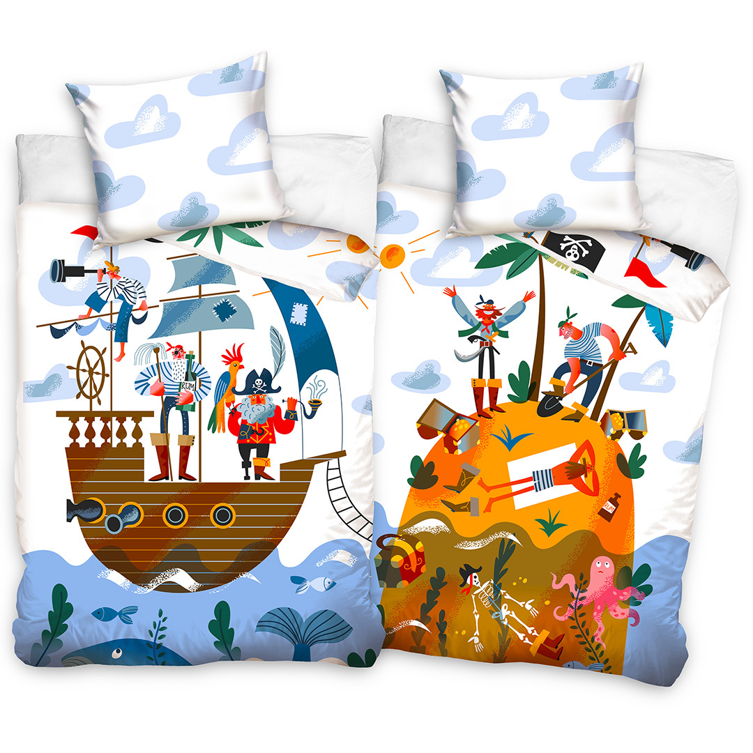 Bawełniana pościel Wyprawa Piratów jest wykonana z 100% gładkiej bawełny renforcé. Ta obustronna pościel ma wymiary kołdry 140x200 cm i poduszki 70x80 cm. Na prawej stronie poszwy kołdry znajduje się piracki statek pełen radosnych piratów. Kapitan z papugą na ramieniu steruje statkiem, podczas gdy inny pirat wyczekuje przez lunetę nowej przygody. Na drugiej stronie kołdry jest wyspa skarbów, gdzie piraci kopią i szukają skrzyń pełnych złota, a jeden z nich odpoczywa na słoneczku. Na poszwie poduszki, która jest taka sama po obu stronach, znajdują się niebieskie chmurki. Pościel posiada certyfikat Oeko-Tex Standard 100 i jest wyposażona w suwak. Odpowiednim kolorem prześcieradła będzie brązowy, jasny i średni niebieski.