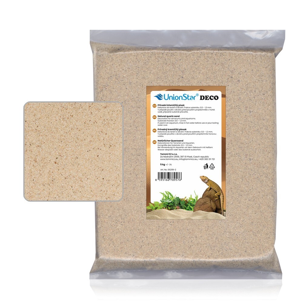 Piasek terraryjny DECO to wysokiej jakości naturalny substrat krzemionkowy o drobnej frakcji 0,5-1,2 mm, dostępny w różnych naturalnych i atrakcyjnych odcieniach kolorystycznych. Piasek jest specjalnie barwiony przy użyciu przetestowanych technologii, bezpiecznych do stosowania w terrariach i akwariach - nie zmienia pH wody ani jej właściwości chemicznych.