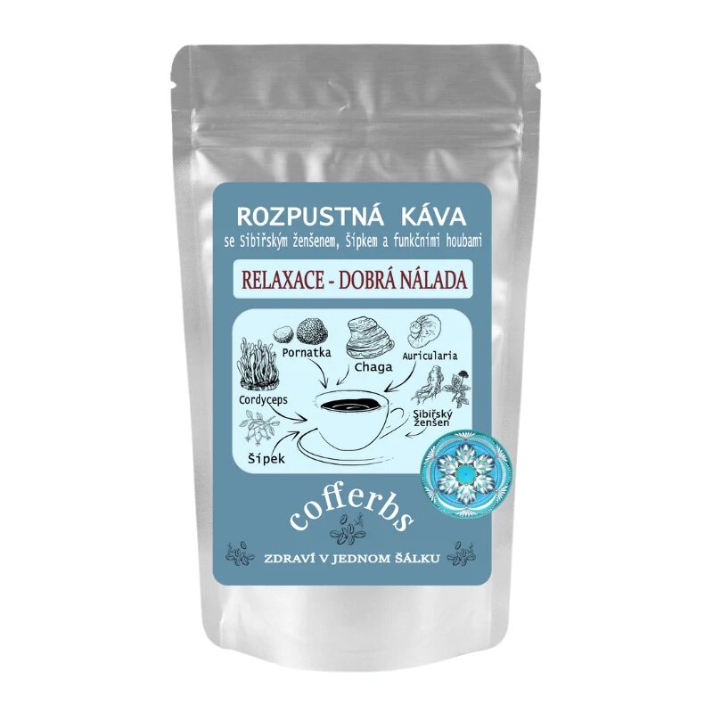 ROZPUSTNÁ KÁVA - Relaxace, dobrá náladaObjevte sílu přírody s našimi produkty obsahujícími adaptogeny a funkční houby.Návod na přípravuRozpustnou kávu zalijte vodou o teplotě 90-100 °C v poměru 1 lžička (3g) na 150 ml vody.Promíchejte a nechte mírně zchladnout.SloženíRobusta 20%, Arabica 80%Směs...