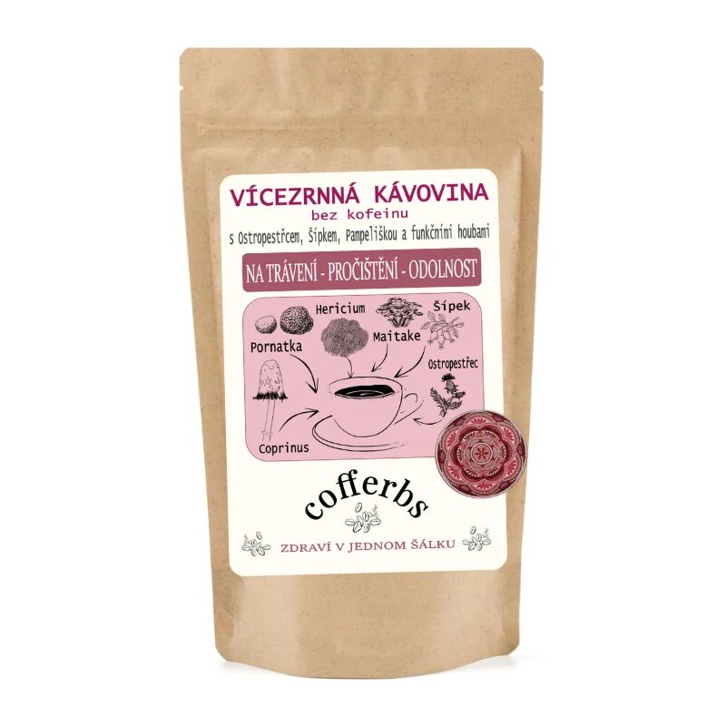 VÍCEZRNNÁ KÁVOVINA - BEZ KOFEINU - Na trávení, očištění, odolnostObjevte sílu přírody s našimi produkty obsahujícími adaptogeny a funkční houby.Návod na přípravuVícezrnnou kávovinu zalijte vodou o teplotě 90-100 °C v poměru 1 lžička (3g) na 150 ml vody.Promíchejte a nechte mírně...