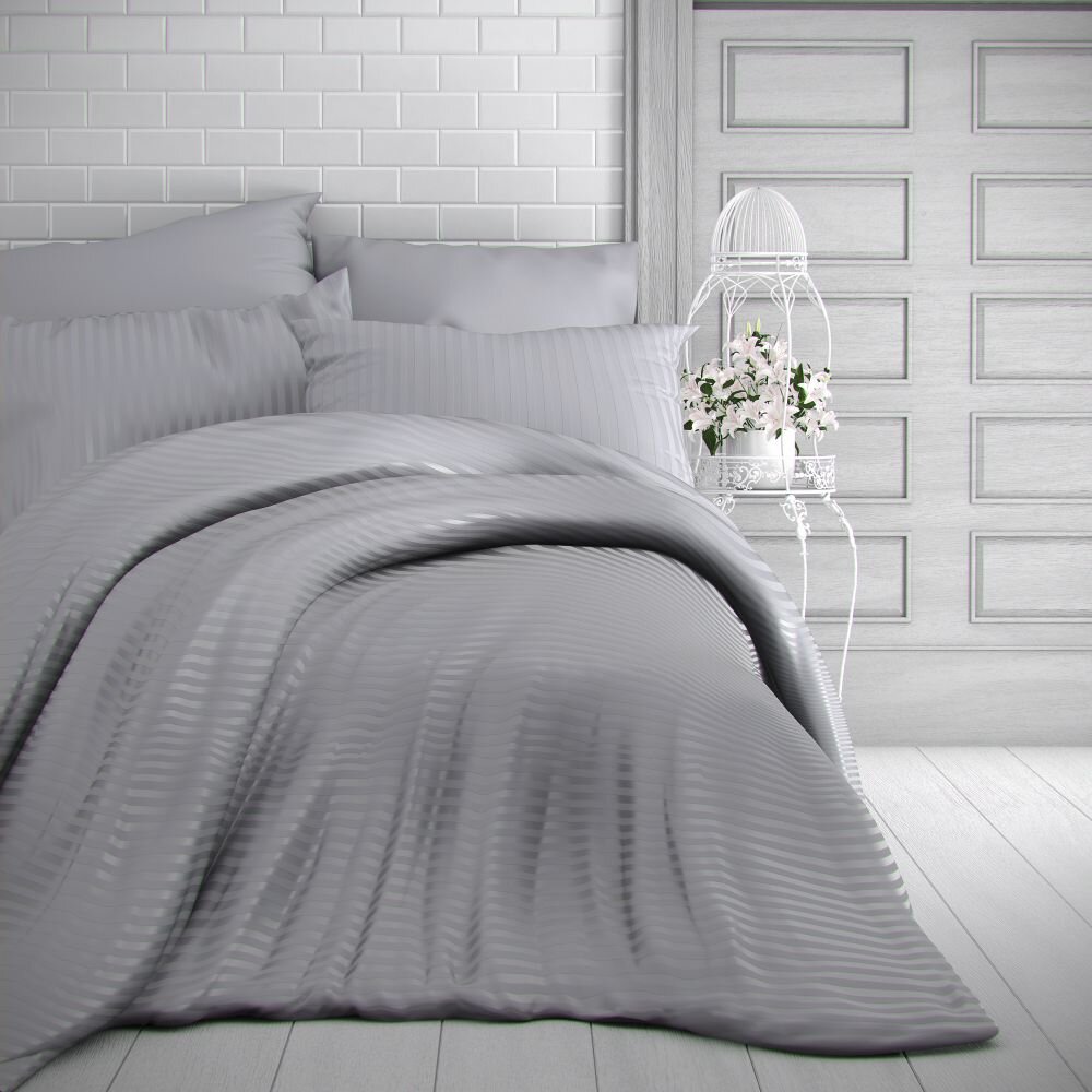 Francouzské saténové povlečení s proužkem 1+2, 200x200, 70x90cm SVĚTLE ŠEDÉ