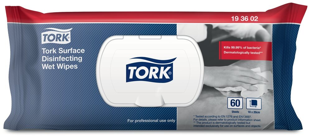 Chusteczki wilgotne Tork do dezynfekcji powierzchni to gotowy do użycia środek dezynfekujący, który działa przeciw szerokiemu spektrum bakterii, w tym koronawirusom. W ciągu 30 sekund niszczy 99,99% otoczkowych wirusów, w tym koronawirusów, bakterii i drożdżaków. Są dermatologicznie testowane i nadają się do twardych, nieporowatych powierzchni i przedmiotów. Opakowanie flowpack zawierające 60 chusteczek z ponownym zamykanym klipsem, który pomaga chronić wilgotność chusteczek.