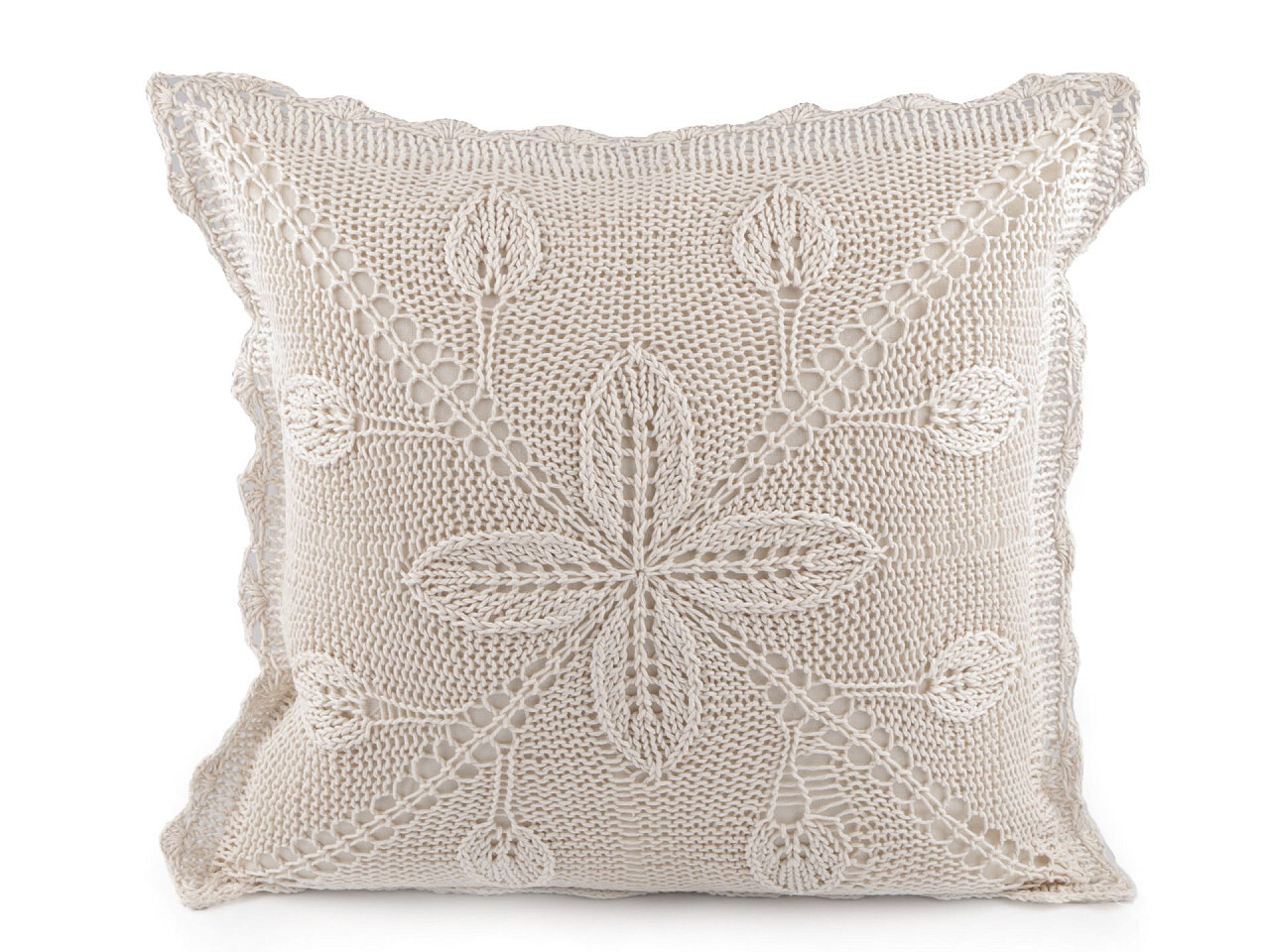 Pletené ažurové povlaky na polštáře jsou dozdobené háčkovanou krajkou. Jsou ideální na vytvoření útulné atmosféry. Dodají vintage nebo boho atmosféru každému interiéru. Na zadní straně se zapínají na zip. Na přední straně polštáře je krajka, zadní strana je jednobarevná. Krajka přesahuje přes...