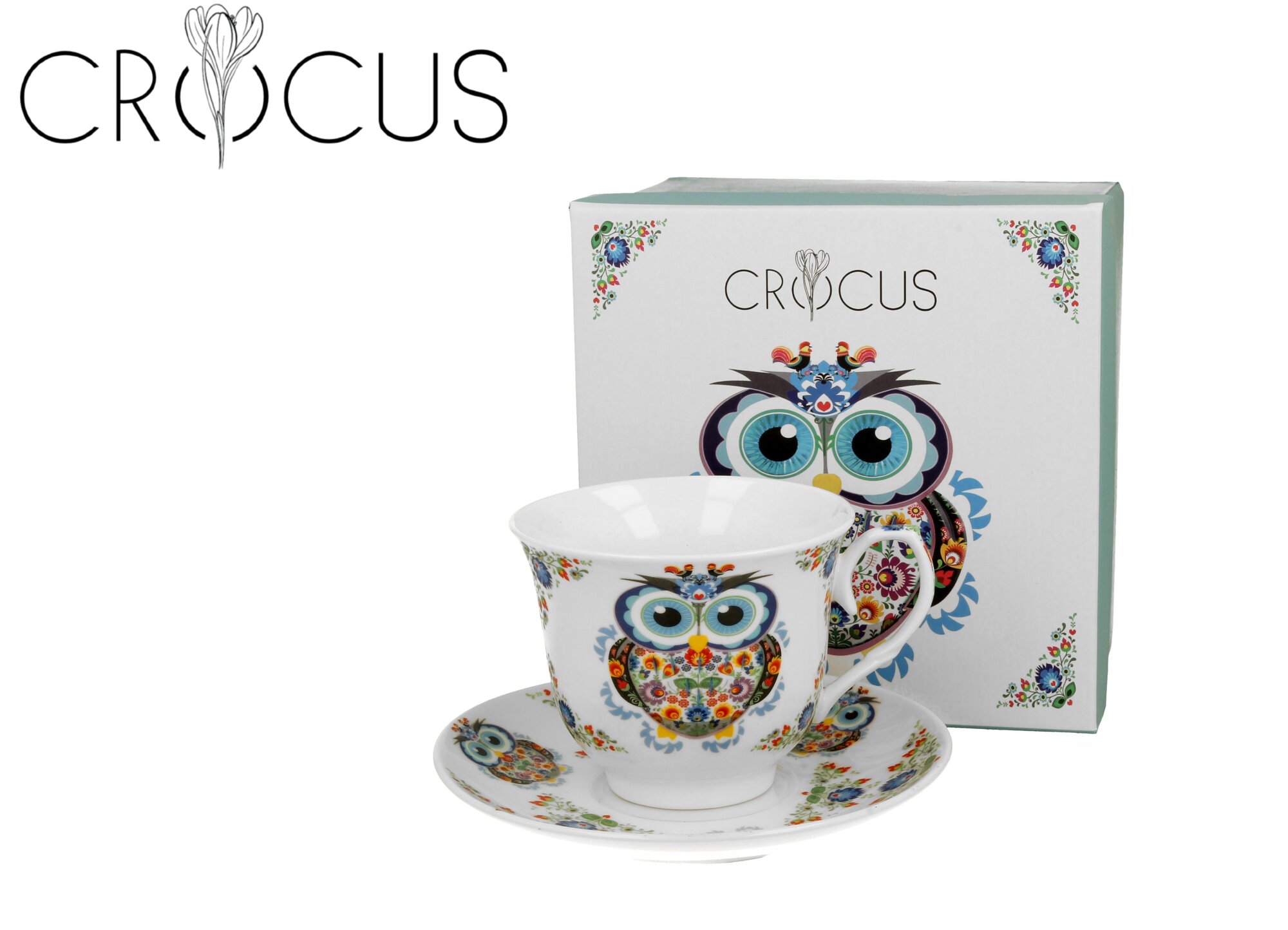 Filiżanka ze spodkiem SOWA ETNO wchodzący w skład serii CROCUS, wykonany z porcelany New Bone China, charakteryzującej się elegancką i naturalną kremowo - białą barwą z delikatnym połyskiem, a także wyjątkową wytrzymałością. Linia zdobiona motywem uroczej sowy wykonanej z etnicznych wycinanek....