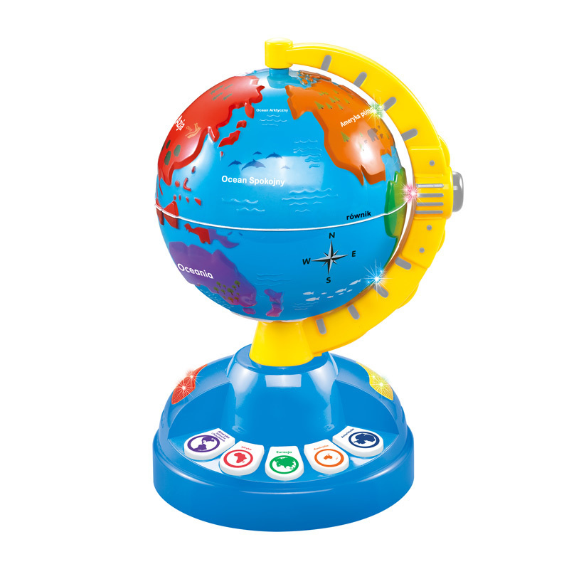 Interaktywny globus z którym możemy się wybrać w podróż dookoła świata.Globus posiada 5 klawiszy funkcyjnych:Ameryka Północna i Południowa,Afryka,Eurazja,Australia,Antarktyda.Naciśnij jeden z klawiszy, a zabawka opowie o wskazanym kontynencie.Globus obraca się w trakcie zabawy.Poznaj ciekawe...