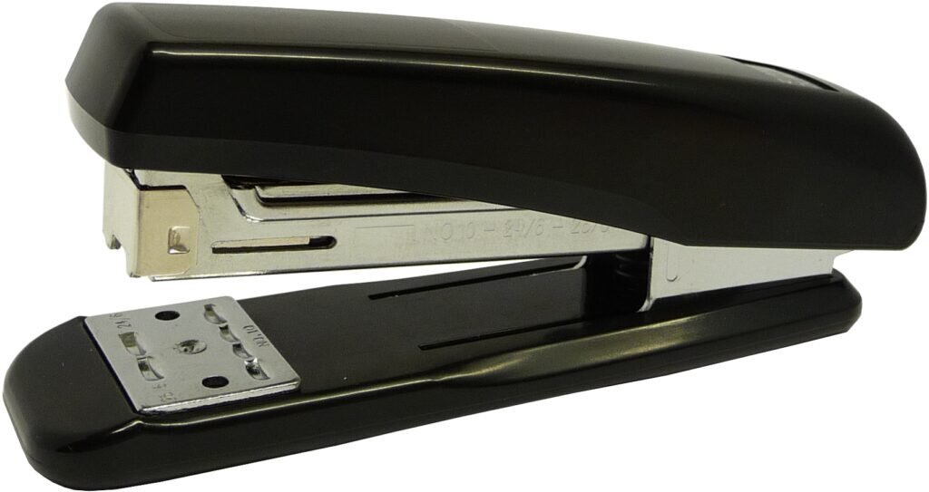 Metalowy zszywacz ze wzmocnioną plastikową podstawą i górną częścią, mechanizm szybkiego uzupełniania,