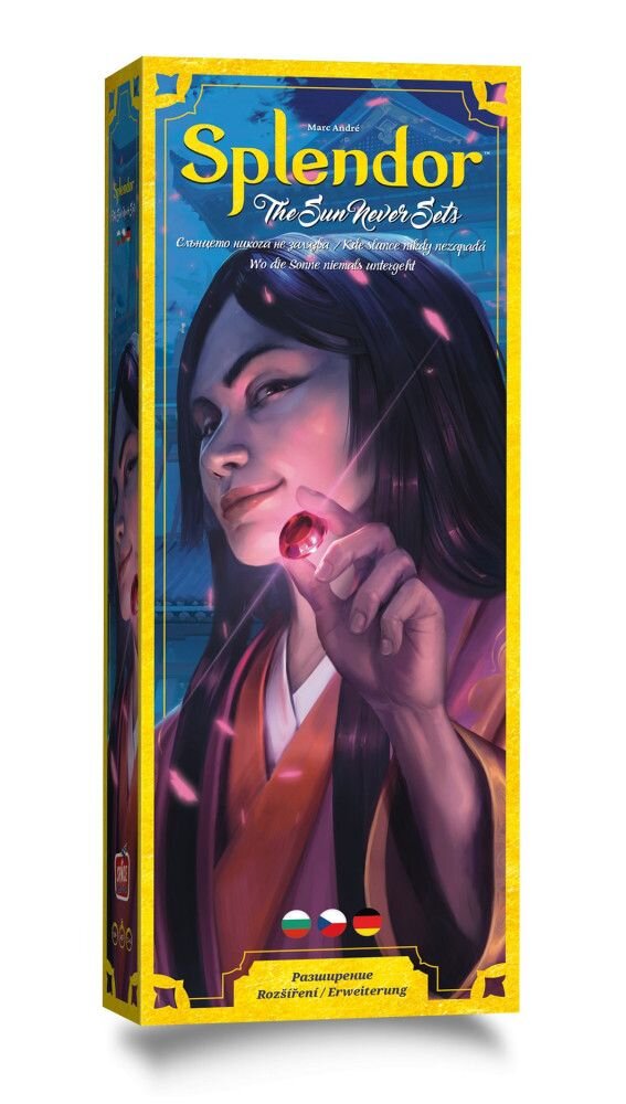 FORTECE Rozmieszczajcie swoje fortece i zdobywajcie kontrolę nad terytorium! Rywalizacja między imperiami handlowymi staje się coraz bardziej zacięta. Wszystkie cechy budują fortece, aby chronić swoje bogactwa przed nieżyczliwymi zamiarami innych, a także przyspieszyć własny rozwój. ORIENT Odkryj cuda Orientu i wykorzystaj swoje nowe umiejętności. Orient otwiera się teraz dla wszystkich, a jego egzotyczna oferta coraz bardziej przyciąga mecenasów sztuki. Czy potrafisz rozszerzyć swoje imperium handlowe? Z tymi dwoma modułami możecie grać z podstawową grą samodzielnie, lub łączyć je ze sobą i/lub używać z innymi dodatkami do gry Splendor. Dodatek Gdzie słońce nigdy nie zachodzi doda waszym rozgrywkom nową porcję emocji! Do gry z tym dodatkiem wymagana jest podstawowa gra Splendor. Zawartość opakowania: