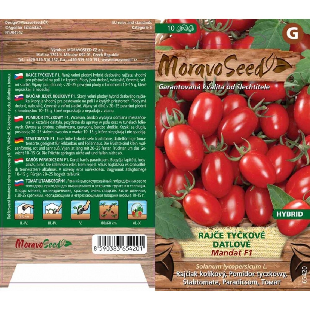 Solanum lycopersicum L. MANDAT F1 Wczesny, bardzo plenna hybryda pomidora daktylowego, odpowiednia do uprawy na polu i w osłonach. Owoce są drobne, cylindryczne, czerwone, bardzo słodkie. Grona są długie, z 20-25 zwartymi owocami o masie 10-15 g, które nie pękają i nie opadają. Zawartość: