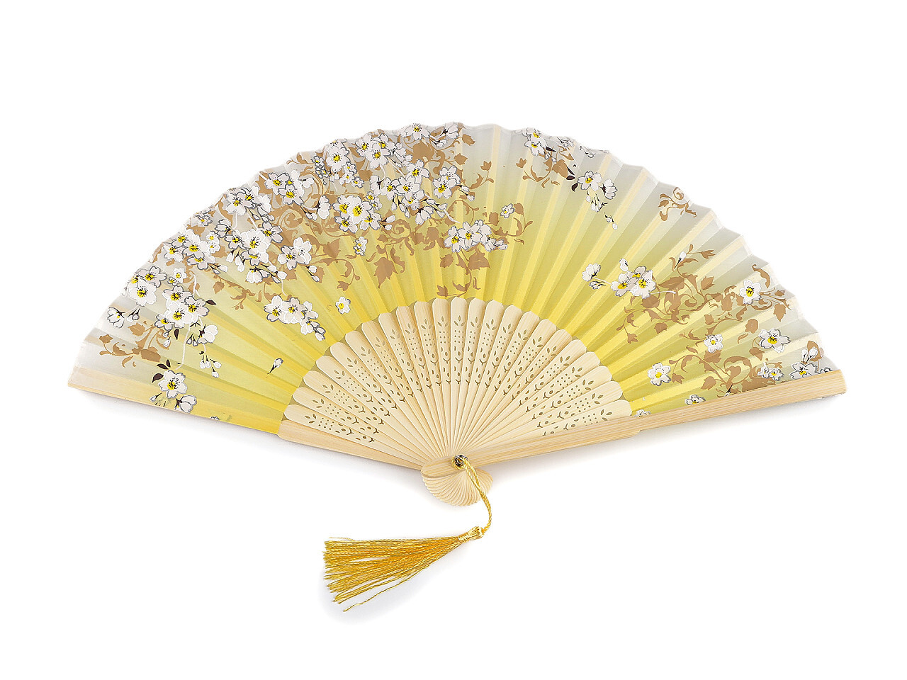 Vějíř textilní s metalickými detaily - 1 ks - 1 žlutá světlá stříbrná