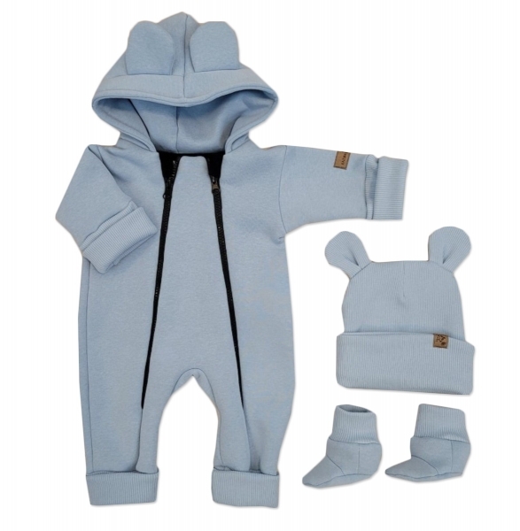 Oteplený dětský overal bez šlapek s kapucí, čepička + botičky, 3D, Kazum, modrý, vel. 74; 74 (6-9m)