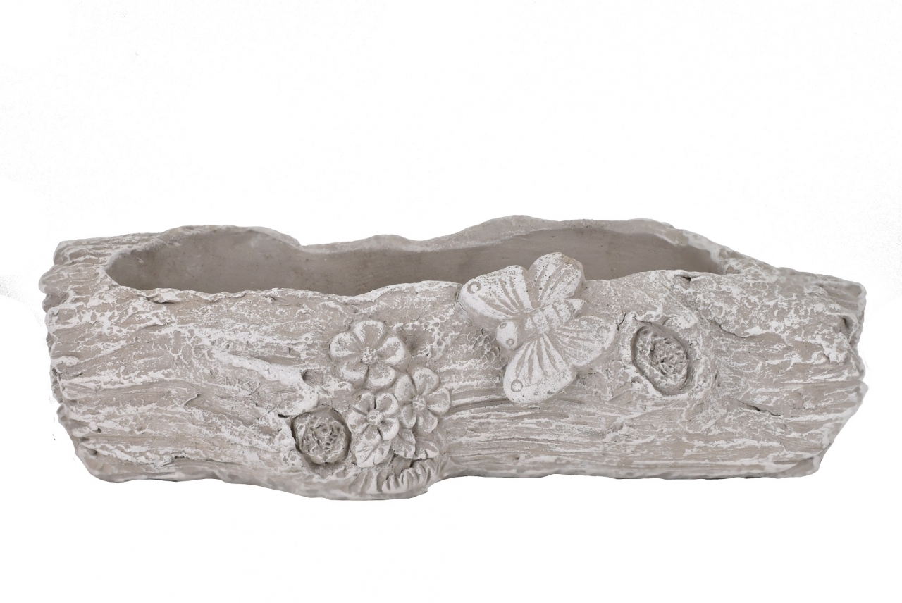 Oryginalna osłonka na kwiaty zdobiona jest pięknym reliefem kory. Materiał: cement Wymiary: