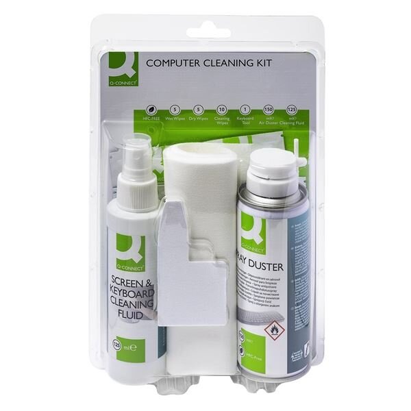 Zestaw czyszczący Q-Connect do akcesoriów komputerowych zawiera wszystko, czego potrzebujesz do konserwacji i czyszczenia komputera; Zestaw zawiera: ; 5 saszetek wilgotnych i suchych chusteczek; 10 chłonnych chusteczek czyszczących; 1 narzędzie do klawiatury; 150 ml sprężonego powietrza do usuwania kurzu; 125 ml płynu czyszczącego; Trwałość: 36 miesięcy; Ostrzeżenie: Przed użyciem jakichkolwiek środków czyszczących zawsze przeczytaj instrukcję producenta!