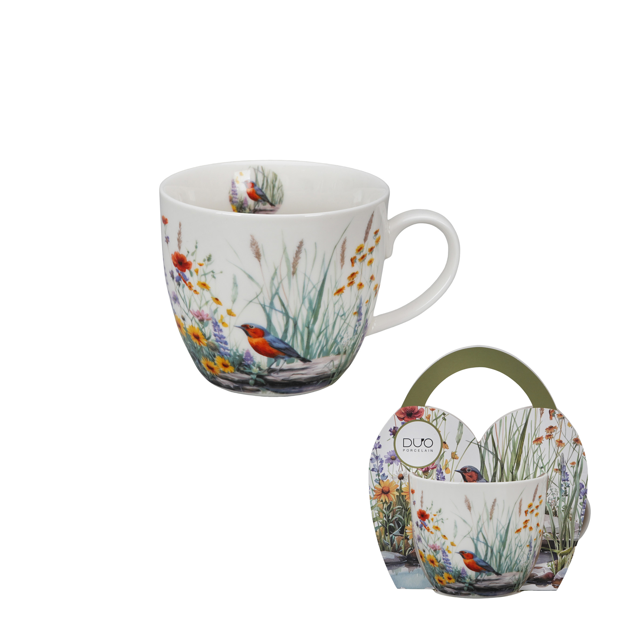 Kubek 460 ml w koszyczku JULY wchodzący w skład linii Kwiaty Classic wykonany z porcelany New Bone China, która charakteryzuje się naturalnym kremowo-białym kolorem z delikatnym połyskiem oraz wyjątkową wytrzymałością i trwałością. Linia zdobiona idyllicznym motywem małego ptaszka, stojącego na...