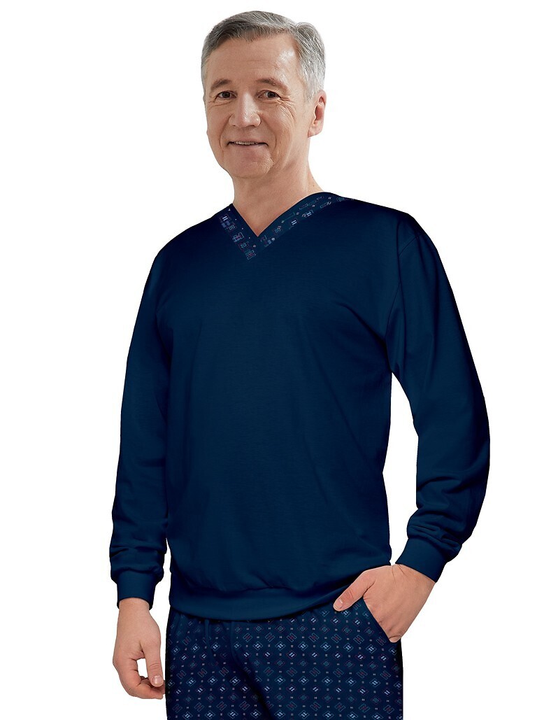 Piżama męska- wysokiej jakości bawełna- bluza jednolita z długim rękawem- wzorzysty dekolt w szpic- na biodrach wygodne kieszenie- nogawki zakończone ściągaczem przeczytaj całość