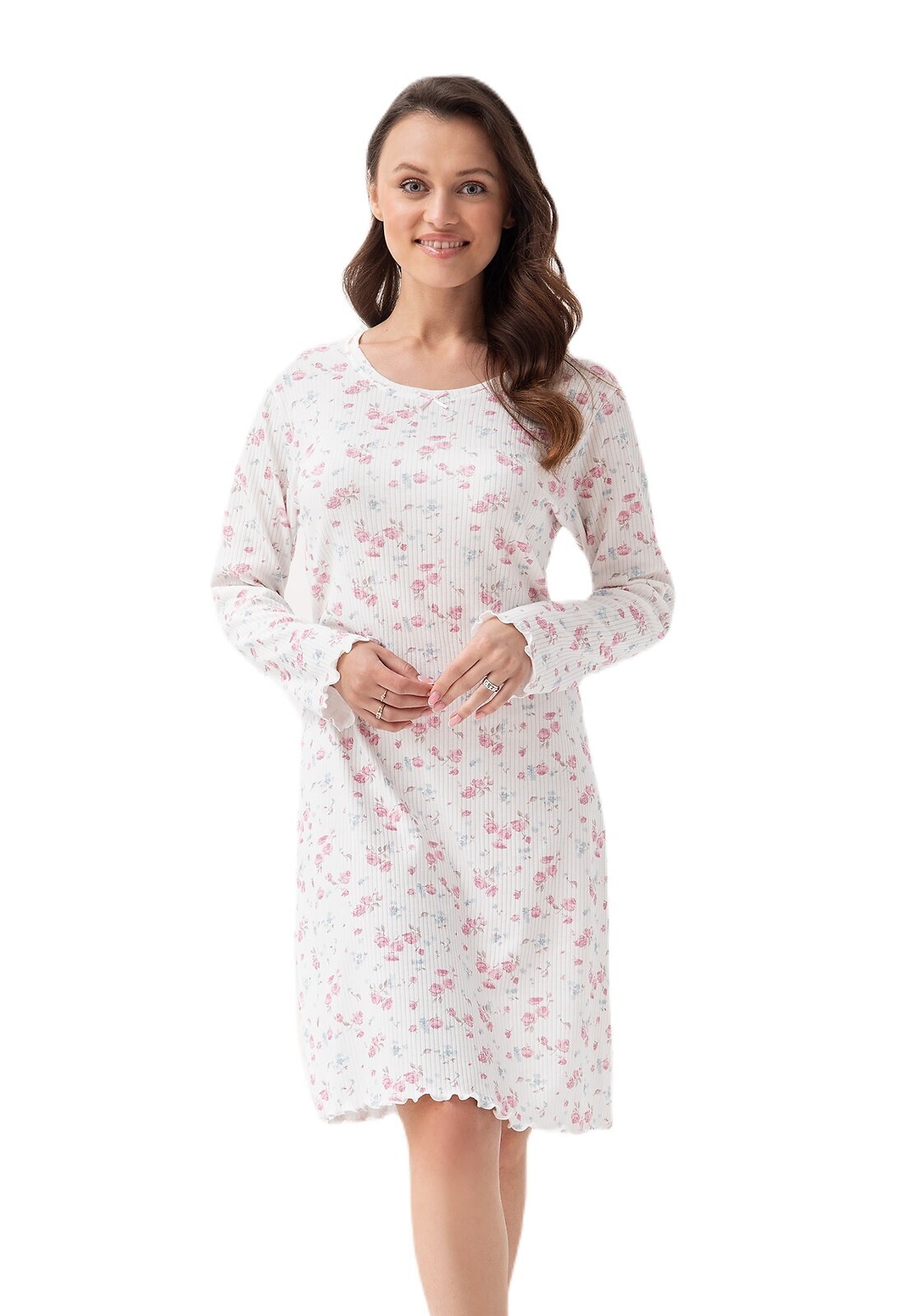 Koszula nocna damska- z miękkiej bawełny w delikatny prążęk- długi rękaw- w kwiatowy nadruk- dekolt półokrągły, zdobiony kokardką- dół koszuli zakończony falbanką (mereżką)- długość przed kolano przeczytaj całość