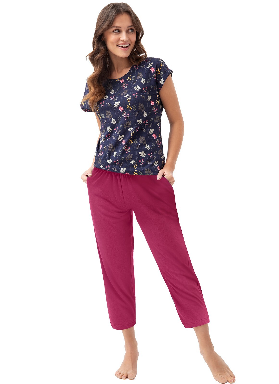 Bawełniana piżama damska- koszulka w kolorowe kwiaty- krótki rękaw- spodnie jednolite, długość 7/8- na biodrach wygodne kieszenie przeczytaj całość