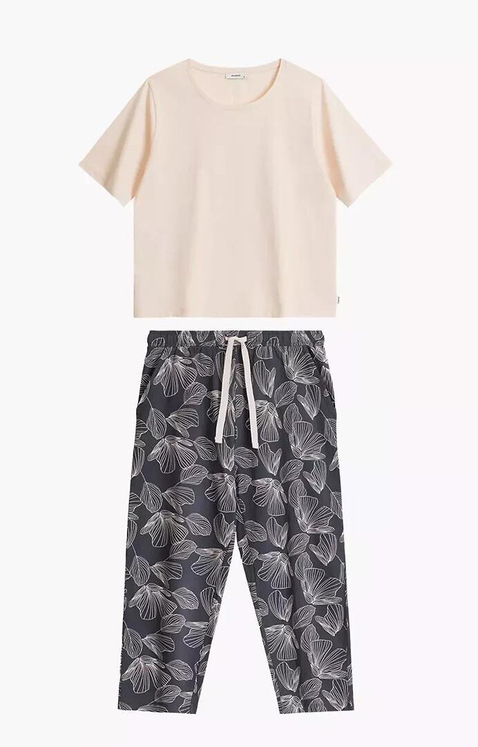 Piżama damska- koszulka jednolita- krótki rękaw- półokrągły dekolt- do kompletu wzorzyste spodnie- długość 3/4- wygodne kieszenie- w pasie wiązane troczki do regulacji obwodu pasa przeczytaj całość