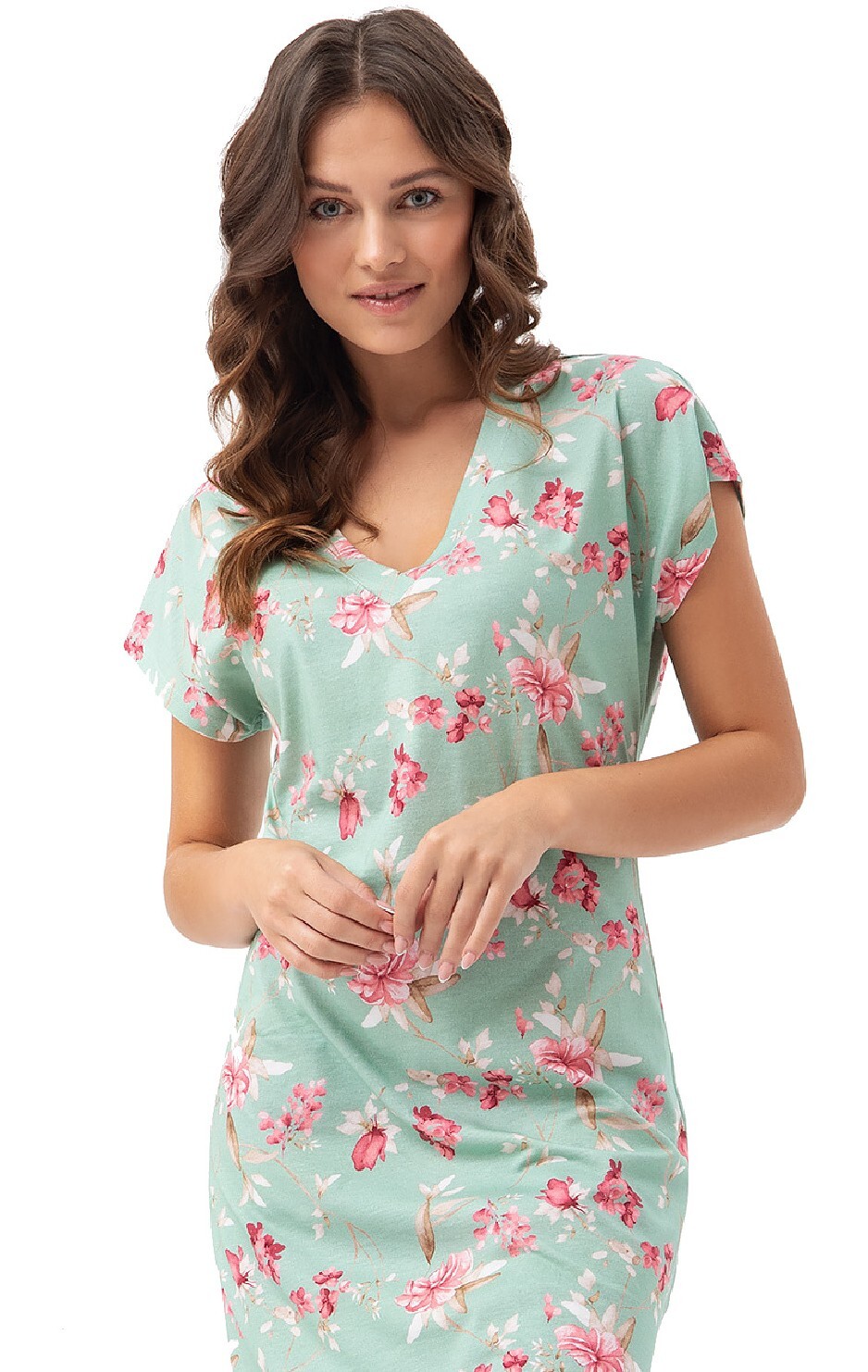 Bawełniana koszula damska- kwiatowy print- dekolt w kształcie litery "V"- krótki rękaw typu kimono- długość do kolan przeczytaj całość
