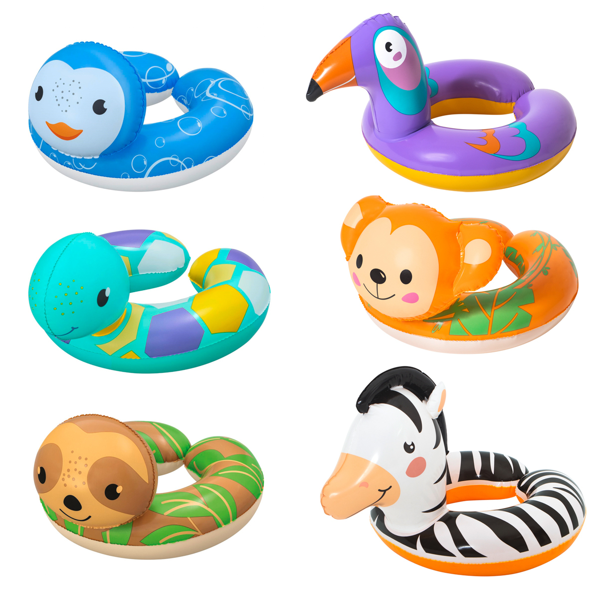 S dmuchanym kołem Bestway pływanie to sama przyjemność! Wybierz pingwina, żółwia, leniwca, tukana, małpkę lub zebrę. Wykonane z wysokiej jakości i wytrzymałego winylu. Wymiary napompowanego koła: 45-57 x 52 cm. Zawartość: 1 dmuchane koło. Zalecany wiek: 3-6 lat. Używać tylko pod nadzorem osoby dorosłej i w wodzie, w której dziecko sięga dnem. Assort to losowy mix modeli. Nie ma możliwości wyboru. Wymiary opakowania: 30 x 18 x 1 cm.