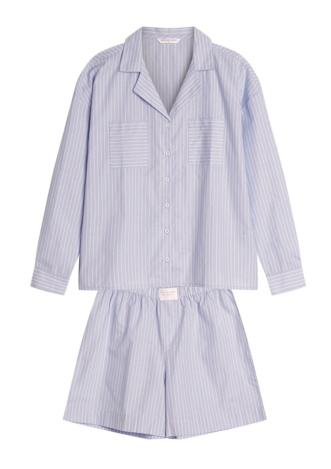 Piżama damska- lekka tkanina bawełniana w paski- koszulka z kołnierzykiem, rozpinana- długi rękaw- na piersiach naszyte kieszonki- krótkie spodenki o luźnym kroju przeczytaj całość