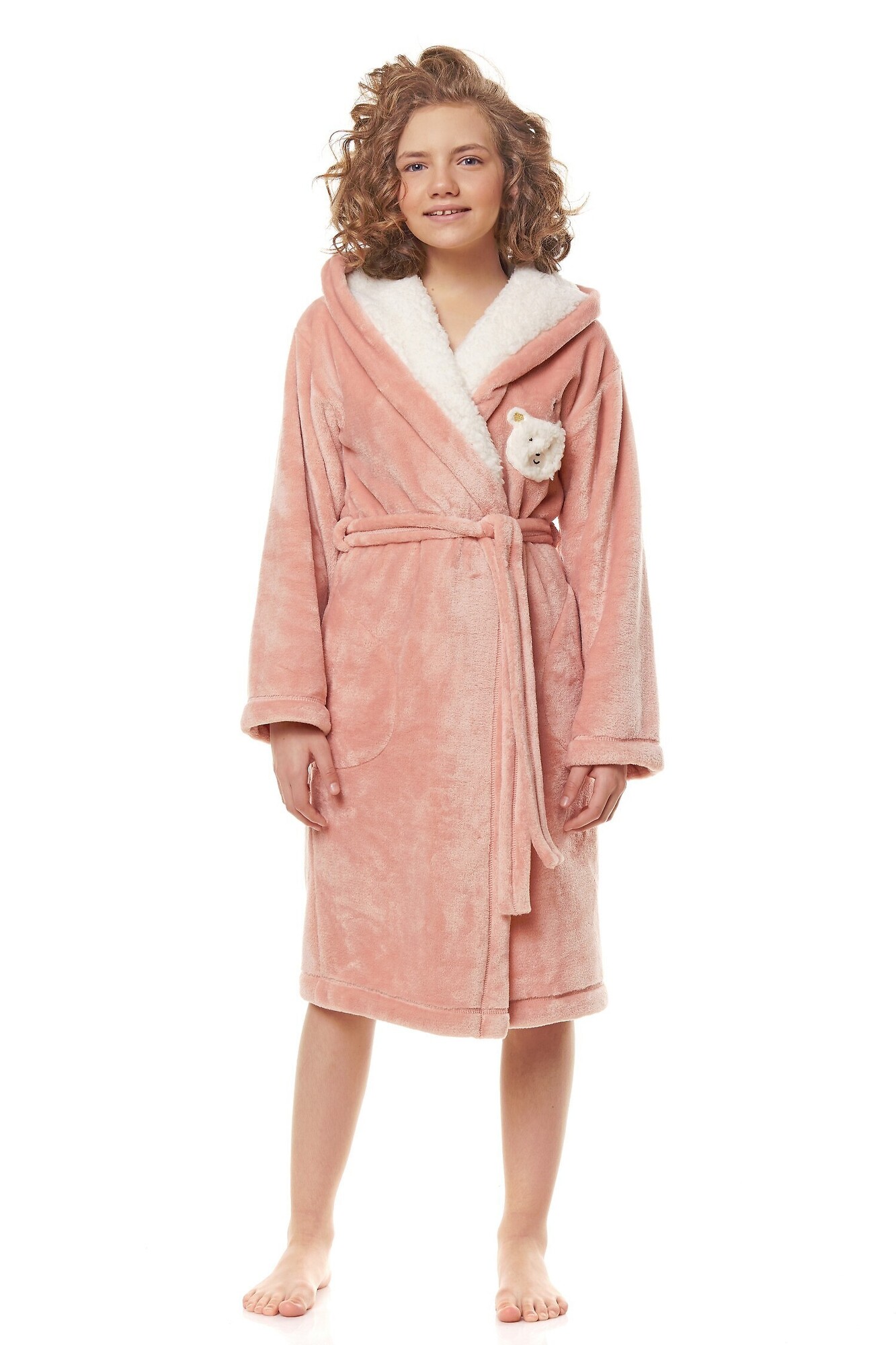 Szlafrok dziewczęcy- miła, gładka tkanina- kaptur obszyty białym futerkiem- na piersi ozdobna aplikacja z misiem- wiązany w pasie- na wysokości bioder wygodne kieszenieSkład: 100% poliester przeczytaj całość