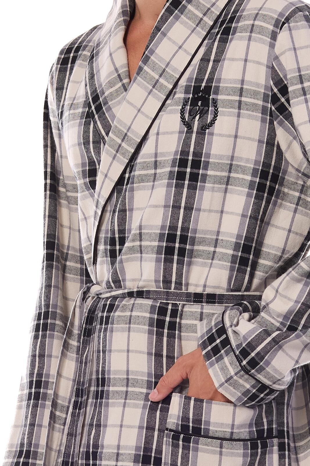 Krótki szlafrok męski- klasyczny fason- ciepła flanela w kratę- szalowy kołnierz- na piersi ozdobny haft- po bokach naszyte kieszenie- wiązany w pasie- długość przed kolano przeczytaj całość