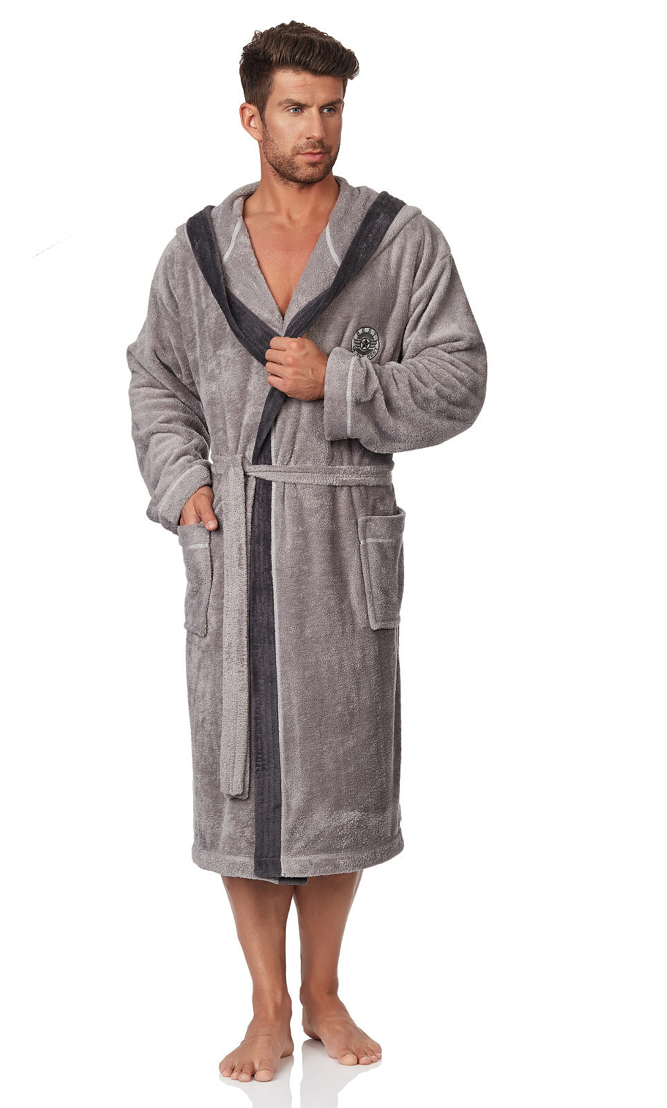 Długi szlafrok męski z kapturem- wiązany w pasie- z miękkiej dzianiny (soft)- na biodrach kieszenie zewnętrzne- na wysokości klatki piersiowej naszyta aplikacja- miły i przyjemny w dotyku, gwarantuje komfort noszenia przeczytaj całość