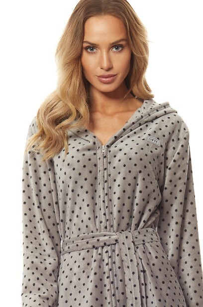 Długi, wygodny szlafrok damski- z miękkiej dzianiny w kropki- z kapturem- zapinany na zamek- na wysokości klatki piersiowej delikatna aplikacja- wiązany w pasie- po bokach kieszenie przeczytaj całość