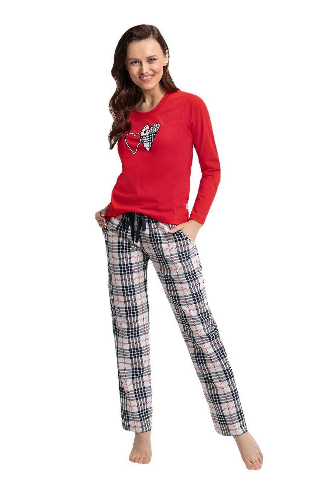 Bawełniana piżama damska- koszulka jednolita z długim rękawem- dekolt półokrągły- przód ozdobiony wzorem w serduszka- długie, flanelowe spodnie w kratkę- w pasie satynowa kokardka- na biodrach wygodne kieszenie przeczytaj całość