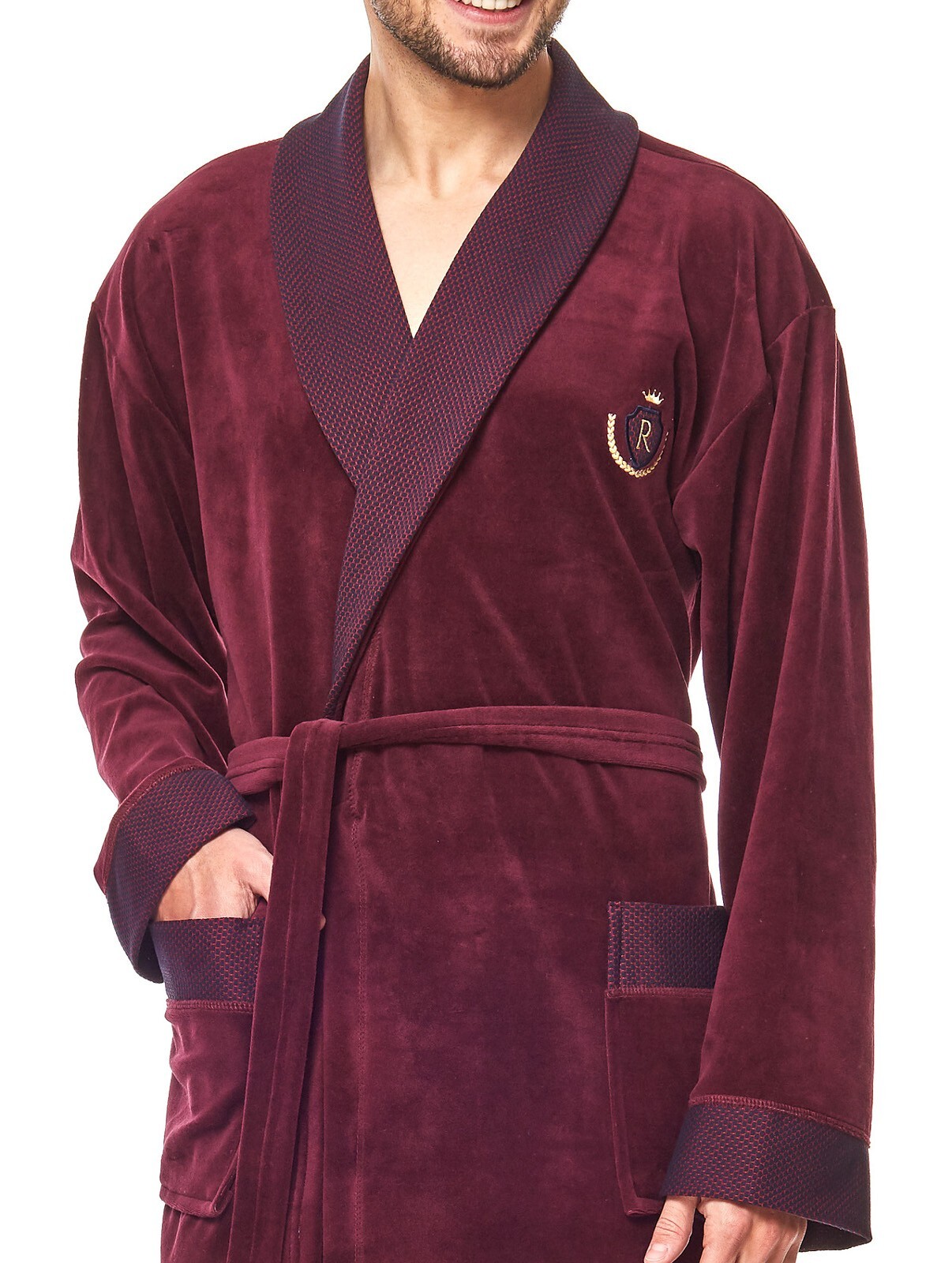 Welurowy szlafrok męski- krótki, z szalowym kołnierzem, wiązany w pasie- na wysokości bioder dwie kieszenie- mankiety, kołnierz i kieszenie wykończone wzorzystą dzianiną, lub gładką z weluru- na wysokości klatki piersiowej mała aplikacja przeczytaj całość