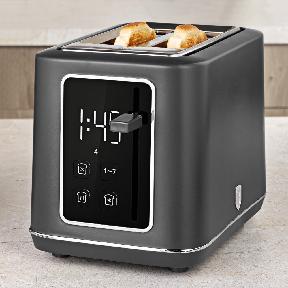 Ten cyfrowy toster w eleganckim, matowym kolorze antracyt oferuje nie tylko stylowy wygląd, ale także praktyczne funkcje do wygodnego przygotowywania ulubionych tostów. Dzięki cyfrowemu wyświetlaczowi LED i siedmiu poziomom opiekania łatwo ustawisz dokładnie takie przypieczenie, jakie lubisz.