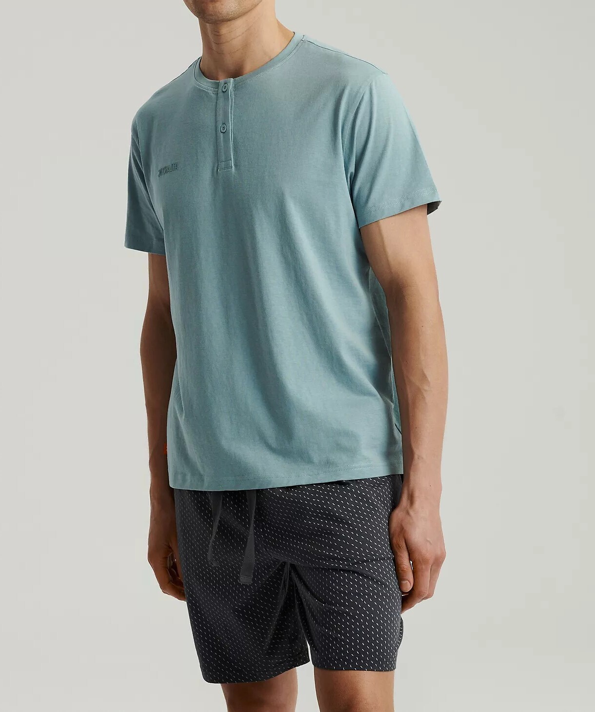 Letnia piżama męska- miękka dzianina z bawełny- koszulka z krótkim rękawem- okrągły dekolt z rozcięciem i dwoma guzikami- luźne, krótkie spodenki ozdobione drobnym wzorem- w pasie guma obszyta dzianiną i wiązany troczek do regulacji obwodu pasa- na biodrach wygodne kieszenie przeczytaj całość