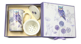 Porcelánový hrnek se sítkem a víčkem – Fialová sova