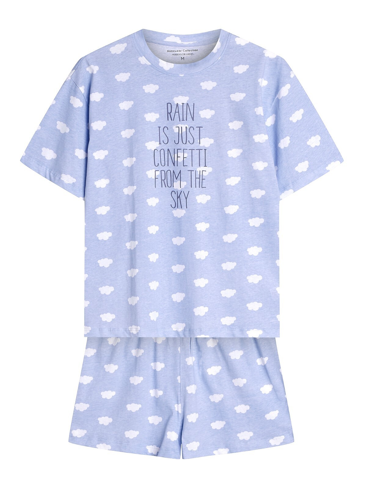 Bawełniana piżama damska- print w chmurki- koszulka z krótkim rękawem- dekolt okrągły- przód ozdobiony nadrukiem- do kompletu krótkie szorty- w pasie elastyczna gumka przeczytaj całość
